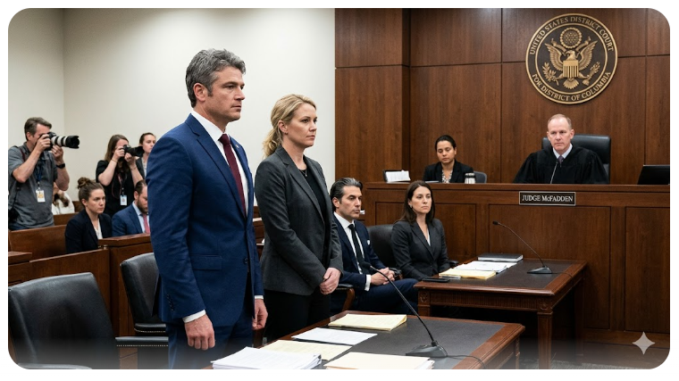 This image is a fake created by artificial intelligence. It depicts the start of Thursday’s Court hearing. Judge Trevor McFadden is sitting in his robes. Defendants Joe Kent is standing, and Allison Lawter, next to him.
