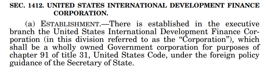 The Development Finance Corporation passed on Oct. 5th, 2018, as part of Public Law 115-254.