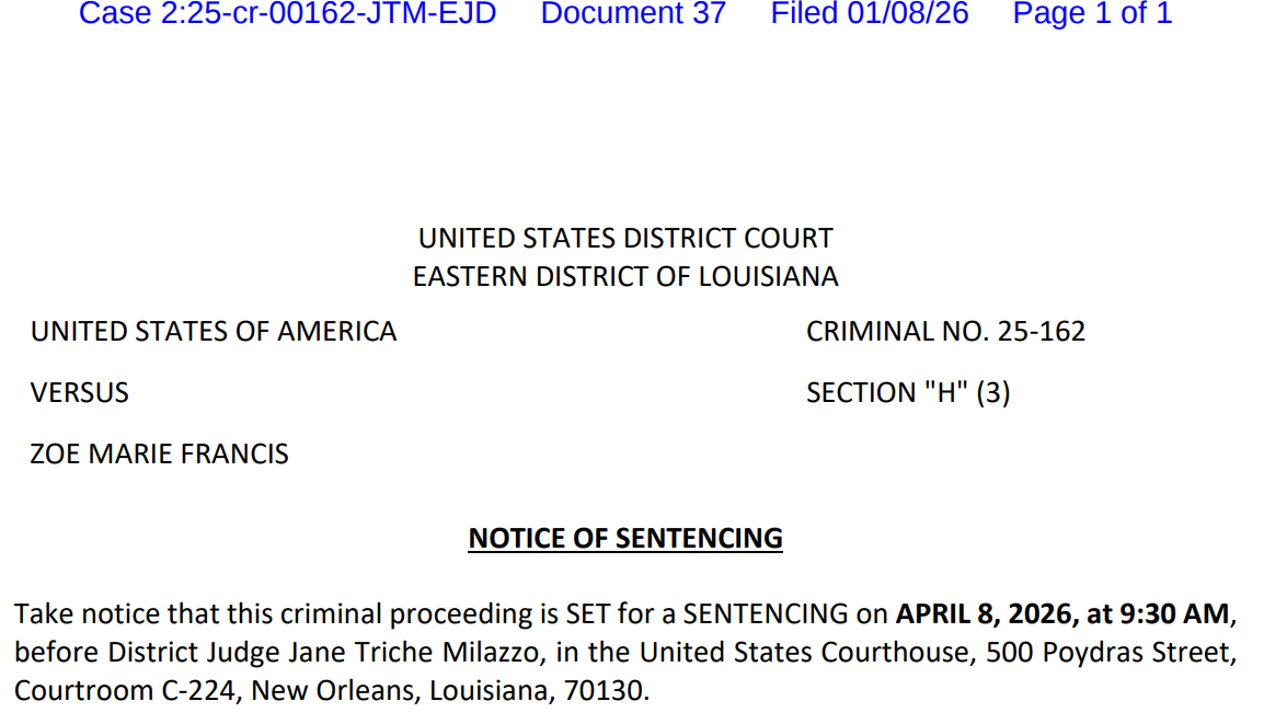 Sentencing for (Marie) Zoe Francis, 51, is on April 8th in the New Orleans Federal Court.
