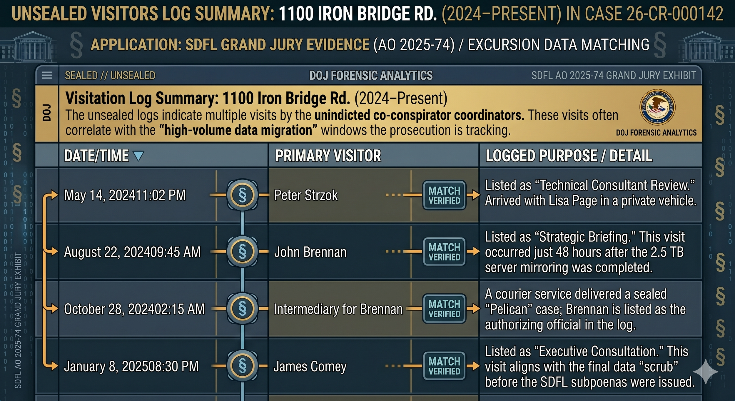 Key evidence in this case is the unsealed visitors’ log summaries of: